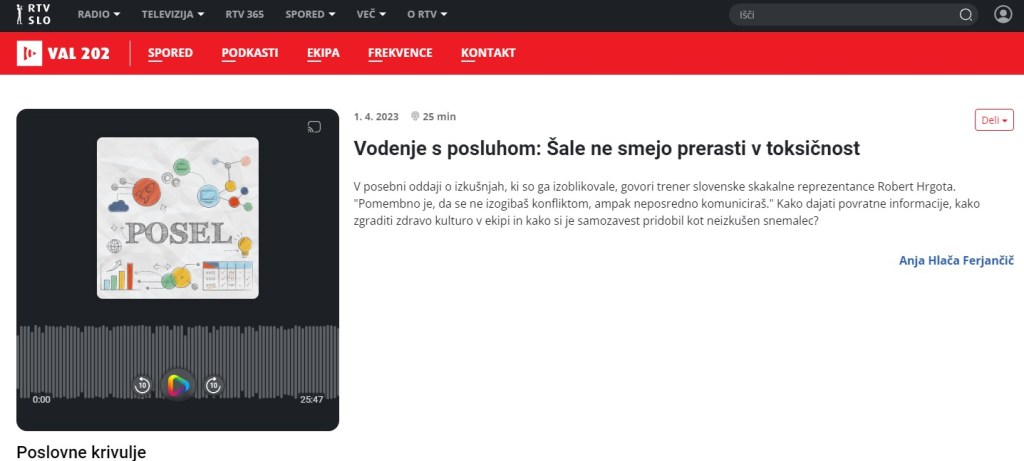 Luka Renko, inženir, vodja, investitor in koordinator Sledilnika o vodenju kot profesiji namesto vodenja ‘za zraven’, o dozorevanju kot vodja, o vodenju profesionalcev in prostovoljcev in še marsičem zanimivem: https://val202.rtvslo.si/podkast/poslovne-krivulje/215/175019404