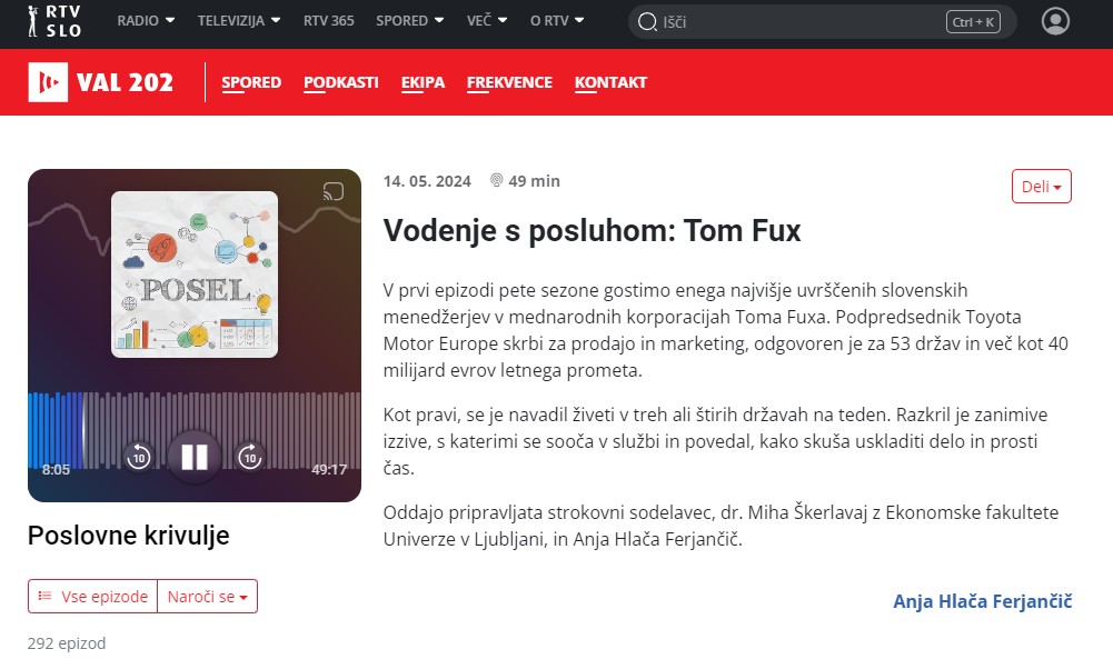 Začenja se peta sezona podcasta Vodenje s posluhom na Valu 202. Tokrat z gospodom Tomom Fuxom, enim najvišje rangiranih Slovencev v mednarodnih korporacijah. Kot podpredsednik Toyota Motor Europe skrbi za prodajo in marketing, odgovoren je za 2000 sodelavcev iz 53 držav in več kot 40 milijard evrov letnega prometa. Kot pravi, se je navadil živeti v treh ali štirih državah na teden. Razkril je zanimive izzive, s katerimi se sooča v službi, o stalnih izboljšavah, kaizenu, psihološkem lastništvu, sistemu stalnih sprememb in karierne rasti ter razvoja. In še veliko več, tudi o organizacijski kulturi, kjer je spoštovanje središčna vrednota, radovednost pa ena ključnih točk poslovne in vodstvene filozofije. “Naša kultura je stara več kot sto let, vendar se vedno znova dopolnjuje”, pravi.